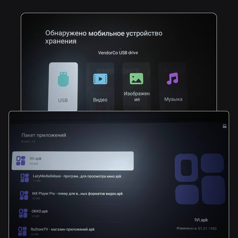 4. Вставляем флешку в ваш проектор, открываем папку, где лежат скачанные файлы, видим там список приложений. Устанавливаем все. Проектор может запросить разрешение на установку приложений - нужно будет его дать.